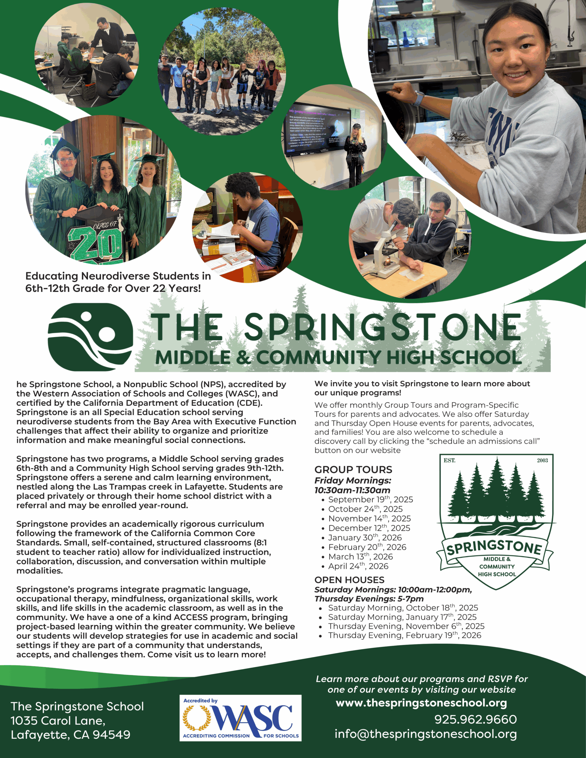 The Springstone School is an independent, non profit, Middle School and Community High School that serves neurodivergent students with Autism Spectrum Disorder (Level 1), Anxiety, Non-verbal Learning Disability, Attention Deficit Hyperactivity Disorder, and other Executive Functioning challenges. We provide a serene environment nestled in the city of Lafayette.