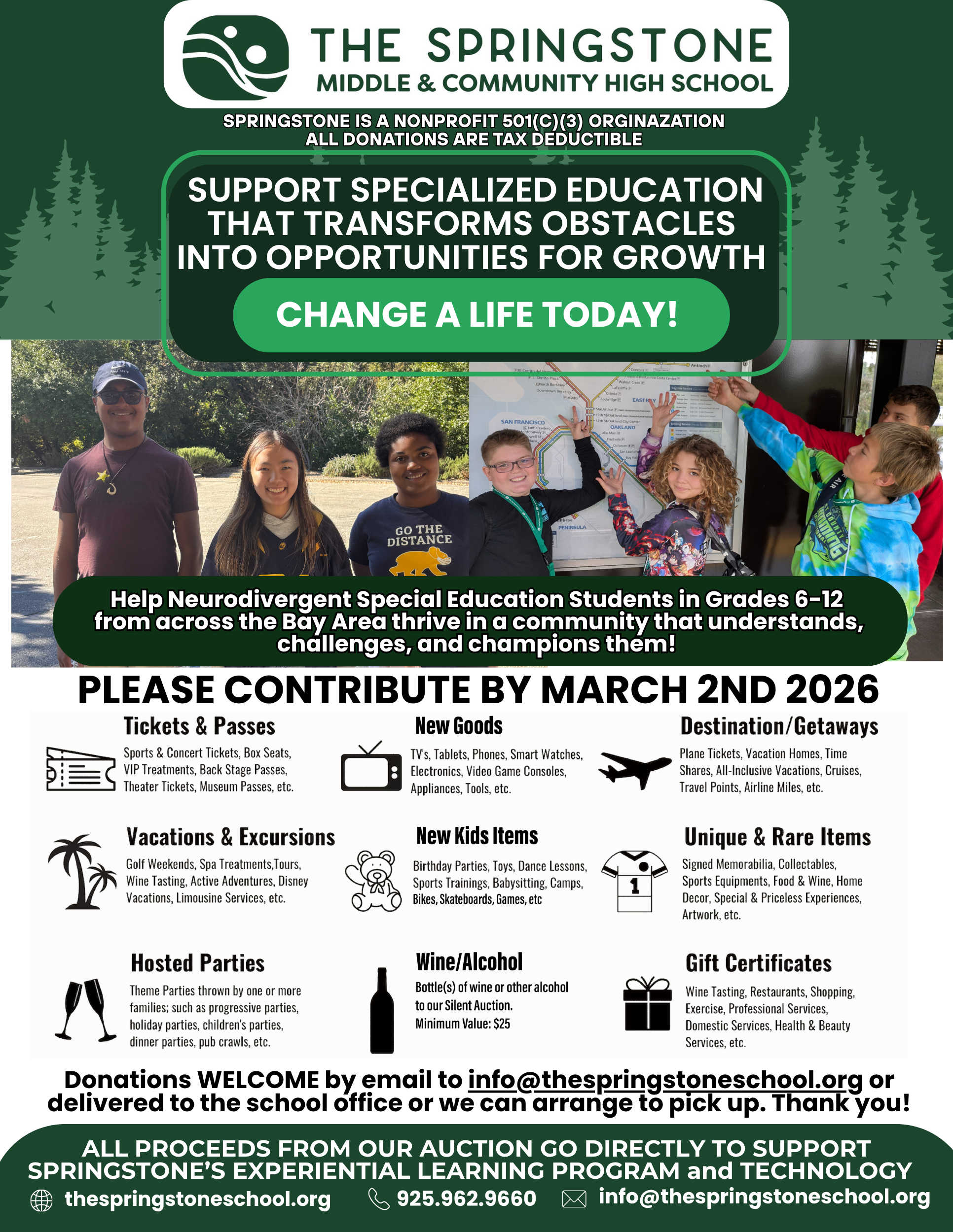 Our mission is to embed social skills, occupational therapy, mindfulness, and community engagement with an academically rigorous curriculum in small classroom settings in order to support the growth, development, and achievement of our neurodiverse population. The Springstone Middle School and The Springstone Community High School are independent, non-profit schools.